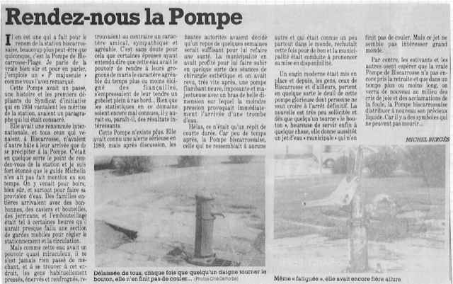 Un engin moderne était mis en place et depuis, les gens, ceux de Biscarrosse et d’ailleurs, portent en quelque sorte le deuil de cette pompe glorieuse dont personne ne veut croire à l’arrêt définitif. La nouvelle est très peu sollicitée et dès que quelqu’un tourne « le bouton », heureuse de servir enfin à quelque chose, elle donne aussitôt un jet d’eau « municipale » qui n’en finit pas de couler. Mais ce jet ne semble pas intéresser grand monde.